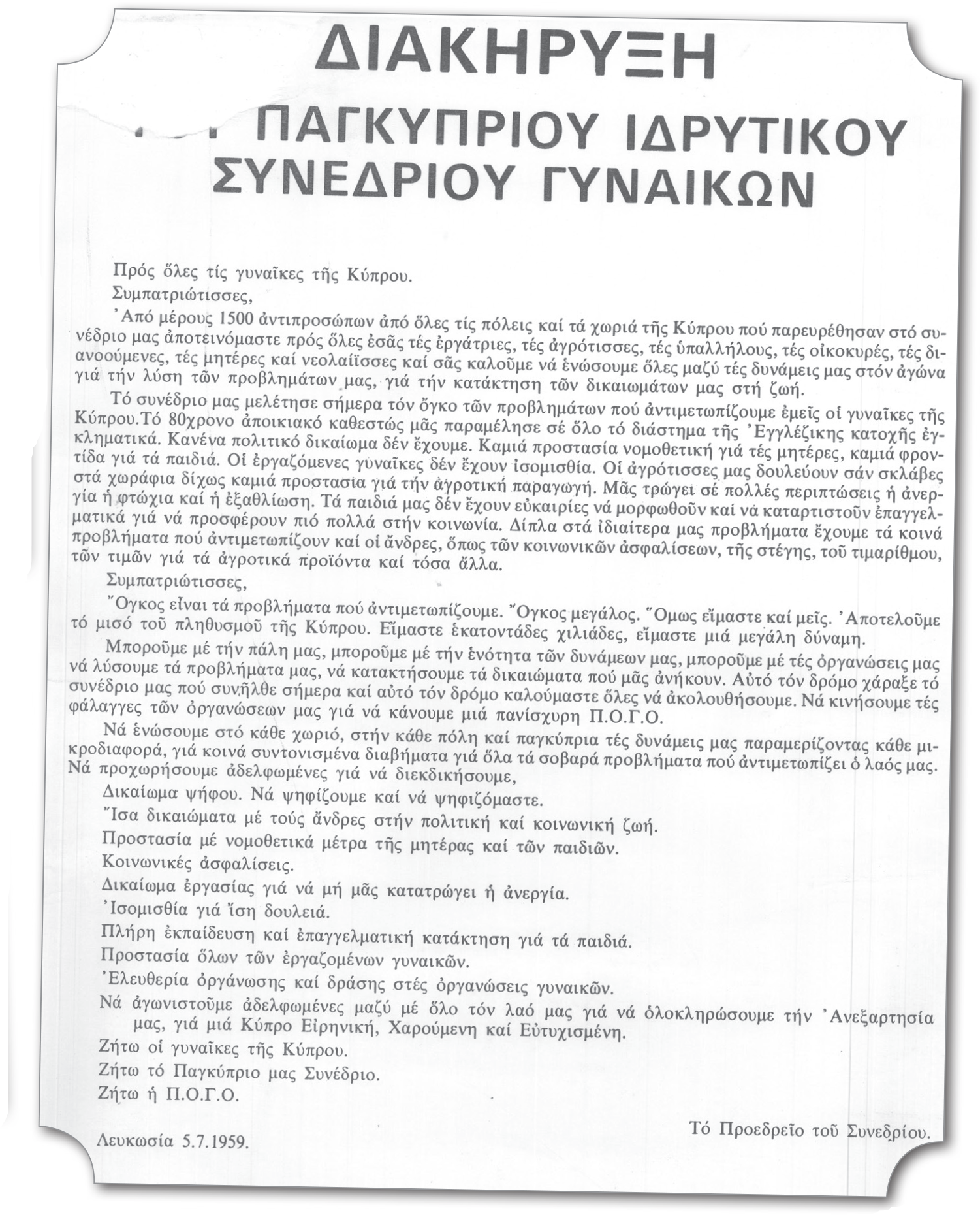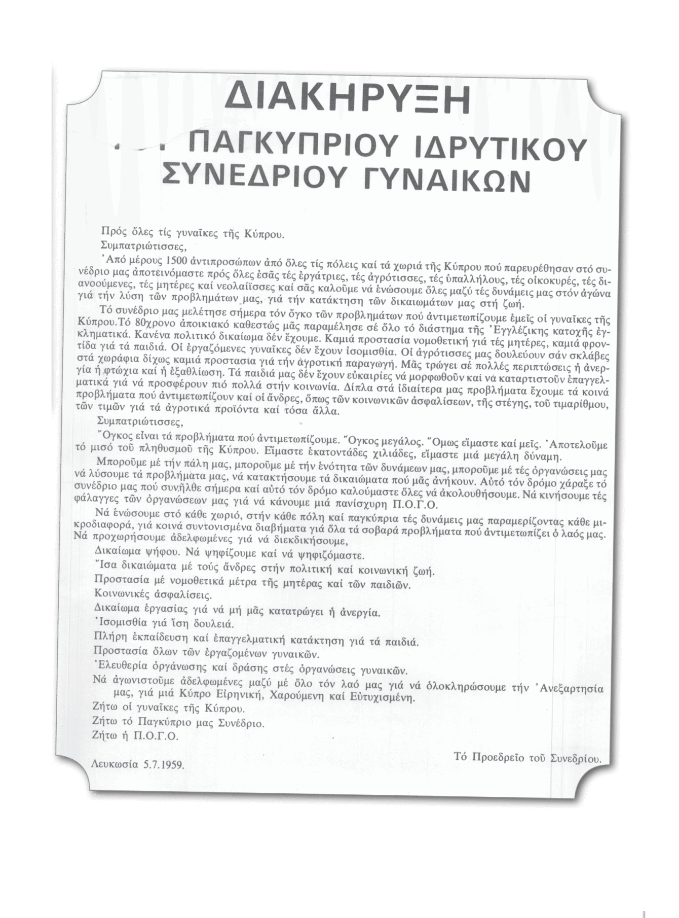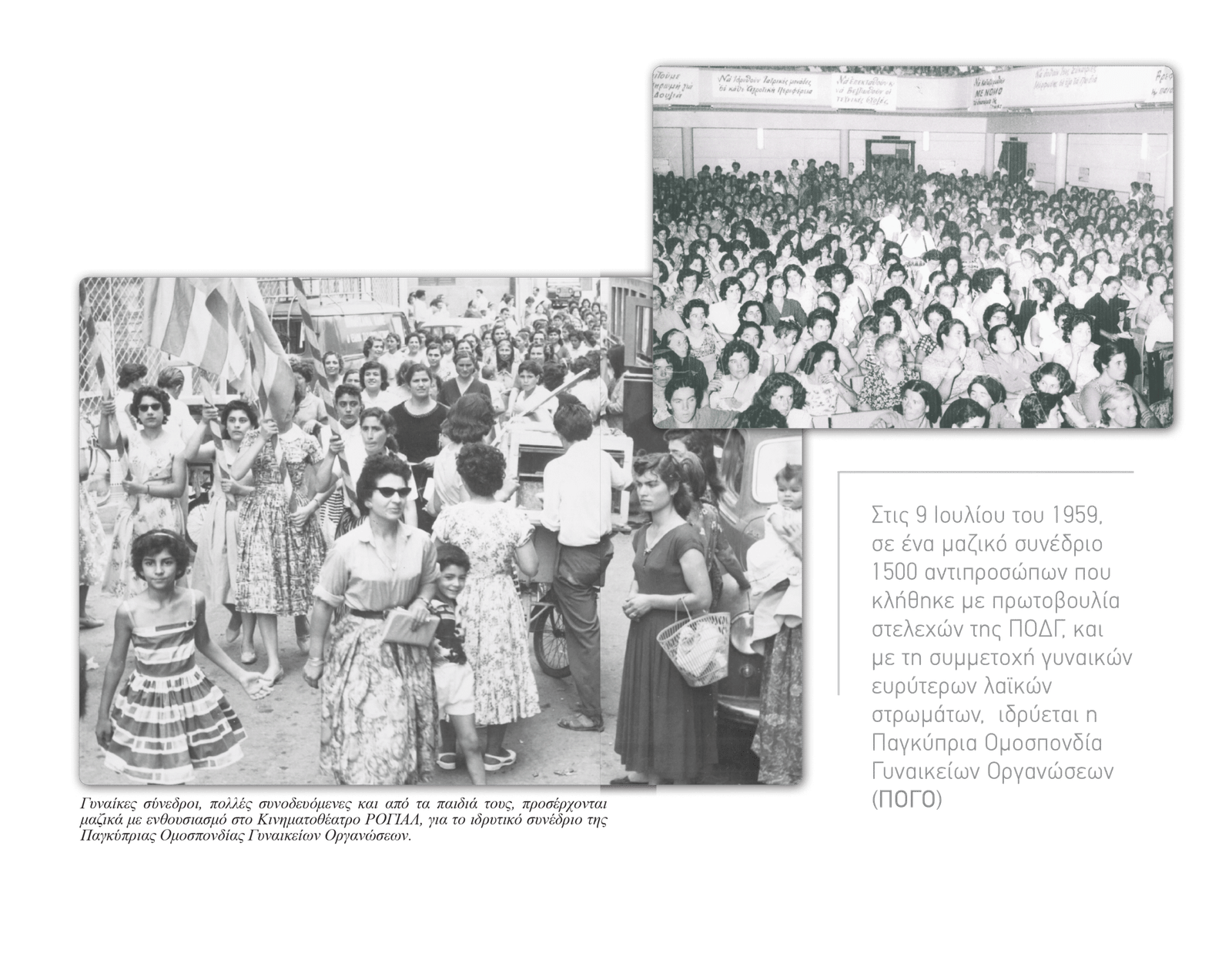 Σε μια αποφασιστική καμπή της ιστορίας της Κύπρου – τη μετάβαση από το αποικιακό καθεστώς στην ανεξάρτητη Δημοκρατία – με ένα μαζικό συνέδριο με 1500 αντιπροσώπους που κλήθηκε με πρωτοβουλία στελεχών της ΠΟΔΓ και με τη συμμετοχή γυναικών ευρύτερων λαϊκών στρωμάτων ιδρύεται στις 9 Ιουλίου 1959 η Παγκύπρια Ομοσπονδία Γυναικείων Οργανώσεων.