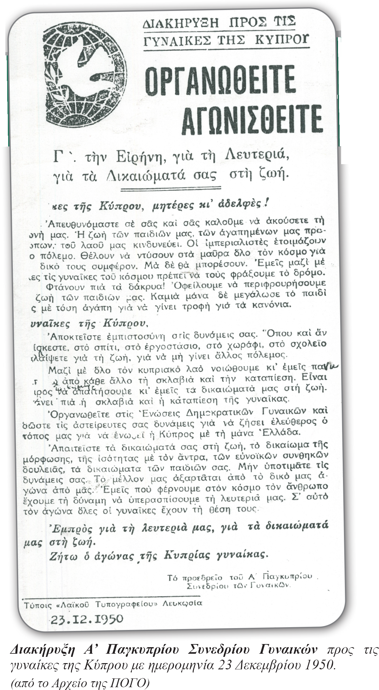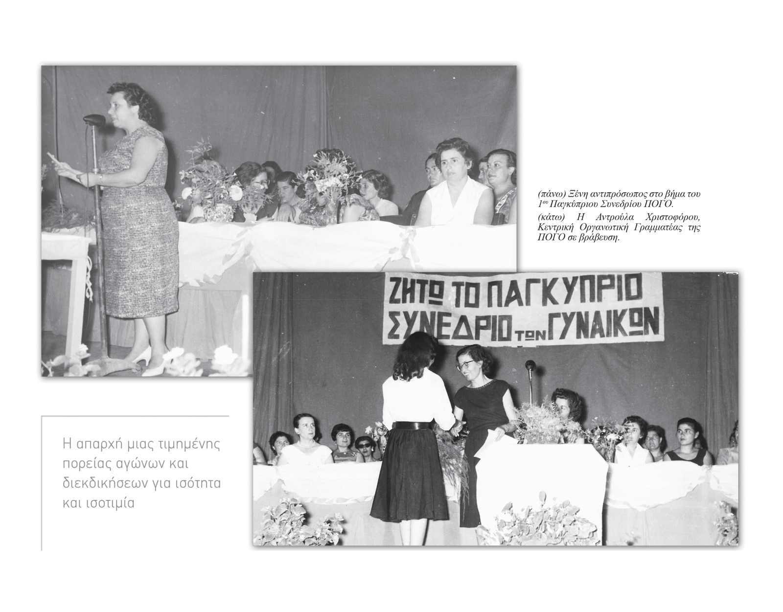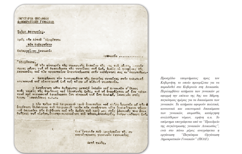 • Σύνθημα: «Η Κυπρία στον αγώνα για Ανεξαρτησία – Ισοτιμία – Ειρήνη».