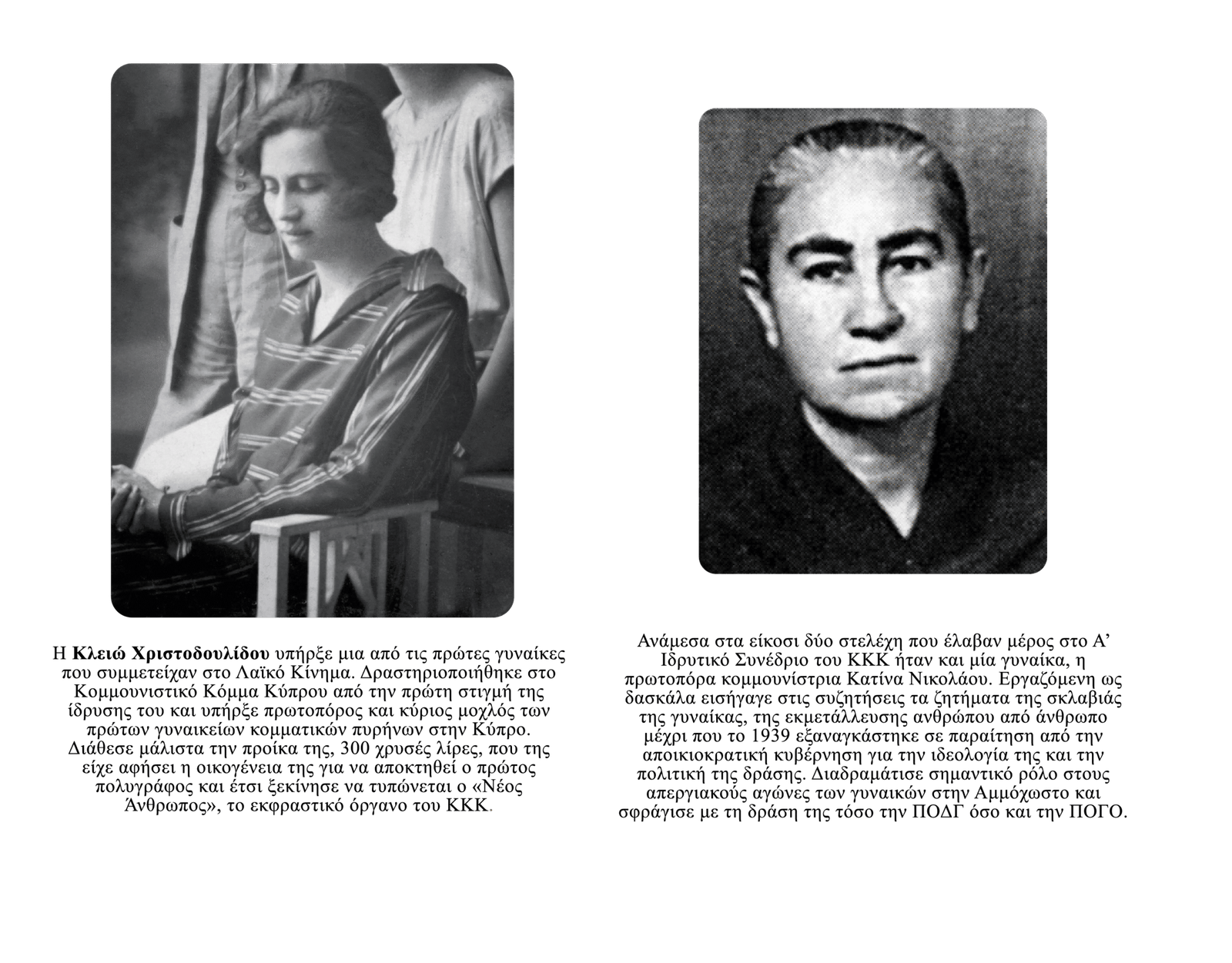 Εκείνη την περίοδο αρχίζουν να συντελούνται στην Κύπρο σημαντικές αλλαγές με κυριότερη την οργάνωση της εργατικής τάξης, η οποία ήταν σαφώς επηρεασμένη από την Μεγάλη Οκτωβριανή Επανάσταση. Έτσι δημιουργείται στην Κύπρο ο πρώτος Μαρξιστικός πυρήνας. Σε αυτόν συμμετέχει και η Κλειώ Χριστοδουλίδου, σηματοδοτώντας την εμπλοκή της γυναίκας της Κύπρου στην πολιτική ζωή. Ακολουθώντας τον ίδιο δρόμο, στην ίδρυση του Κομμουνιστικού Κόμματος Κύπρου το Δεκαπενταύγουστο του 1926, συμμετέχει μια άλλη πρωτοπόρα γυναίκα, η Κατίνα Νικολάου, η οποία υπήρξε και η πρώτη γυναίκα μέλος του πολιτικού του γραφείου. Με φορέα το ΚΚΚ, γίνεται η αρχή για κοινή πάλη αντρών και γυναικών για διεκδίκηση δικαιωμάτων που θα άλλαζαν τις άθλιες συνθήκες ζωής του κυπριακού λαού.