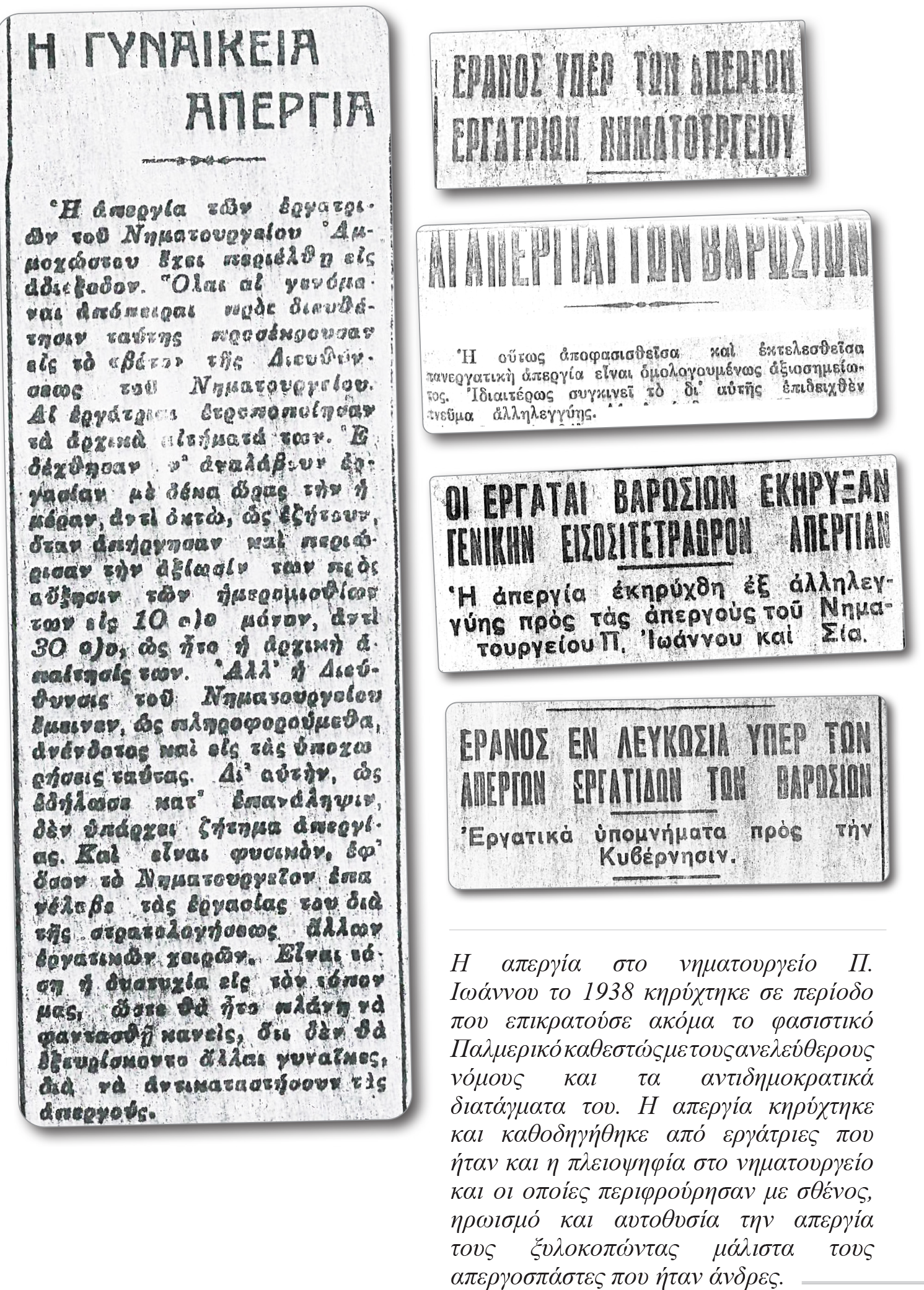 Στα πρώτα βήματα οργάνωσης της εργατικής τάξης, τις δεκαετίες του 1920 και του 1930, οι εργαζόμενες γυναίκες, με την καθοδήγηση του ΚΚΚ, διαδραμάτισαν καθοριστικό ρόλο. Συμμετείχαν δυναμικά στις μεγάλες κινητοποιήσεις και στους απεργιακούς αγώνες που πραγματοποιήθηκαν μέσα στις συνθήκες της μεγάλης οικονομικής κρίσης και της τρομοκρατικής παλμεροκρατίας. Σε αυτό το περιβάλλον, γύρω στα τέλη της δεκαετίας του 1930 γεννήθηκε και η ιδέα για την οργάνωση γυναικείων πυρήνων διεκδίκησης, κι έτσι δημιουργήθηκαν οι πρώτες Ενώσεις Εργαζομένων Γυναικών. Προτεραιότητα δόθηκε στα εργασιακά προβλήματα που αντιμετώπιζαν οι γυναίκες στα συσκευαστήρια πατατών, στα υφαντουργία και στα νηματουργία, στη θέσπιση νομοθεσίας για τις υπηρέτριες και στο αίτημα της ισομισθίας ανάμεσα σε άντρες και γυναίκες, δασκάλους και νοσηλευτές.
