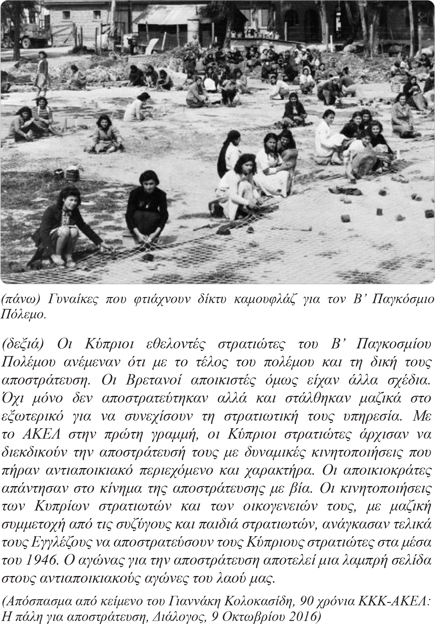 Το 1943, μετά την κατάταξη χιλιάδων Κύπριων εθελοντών στις Συμμαχικές Δυνάμεις ενάντια στο χιτλεροφασισμό, δημιουργήθηκαν οι Ενώσεις Συζύγων Κύπριων Εθελοντών που αξίωναν μαχητικά, την ικανοποίηση αιτημάτων σχετικά με τις απολαβές των συζύγων τους. Με τη λήξη του πολέμου, διεκδίκησαν σθεναρά, με μαζικές κινητοποιήσεις ενάντια στην αποικιακή διοίκηση, την αποστράτευση των συζύγων τους.