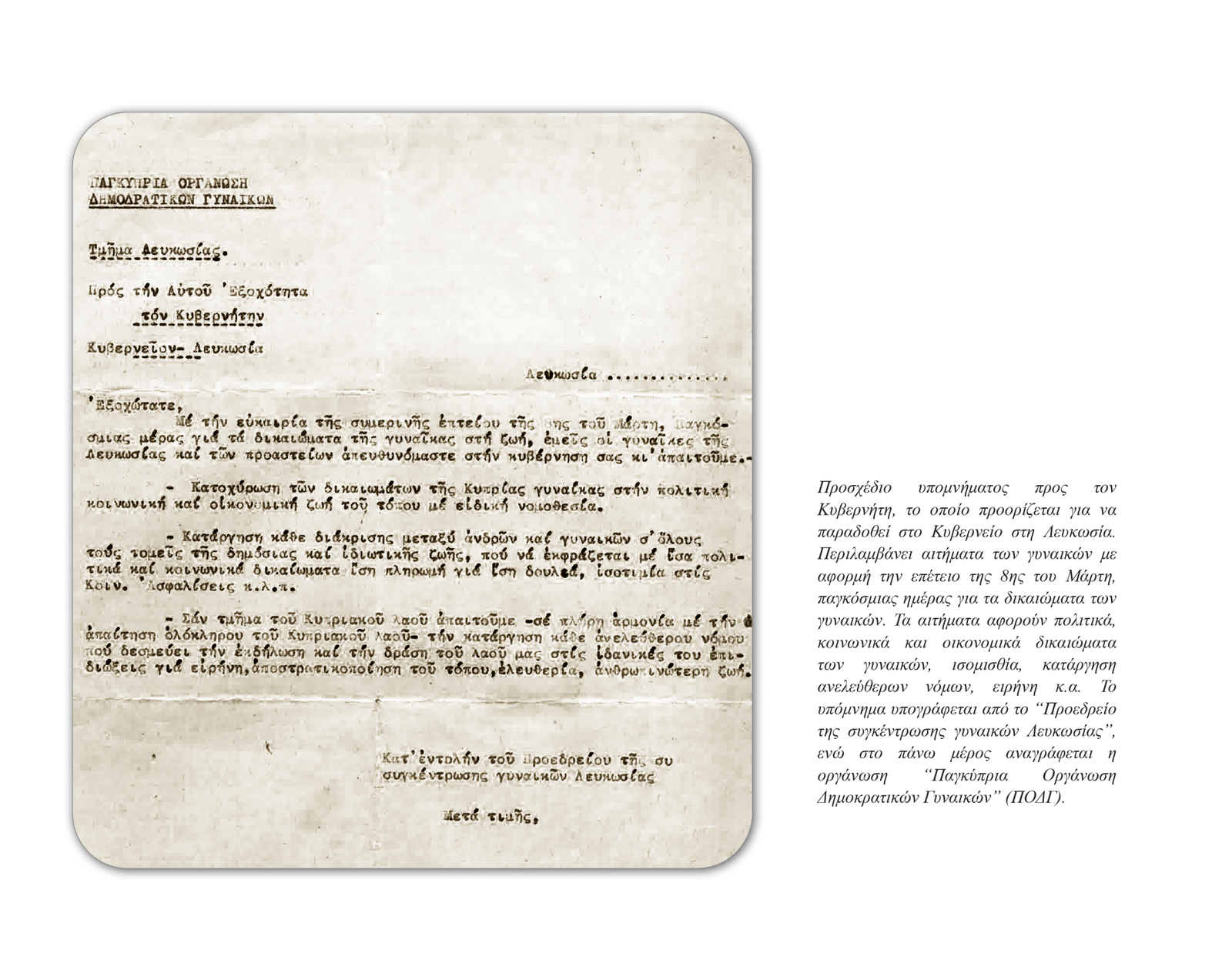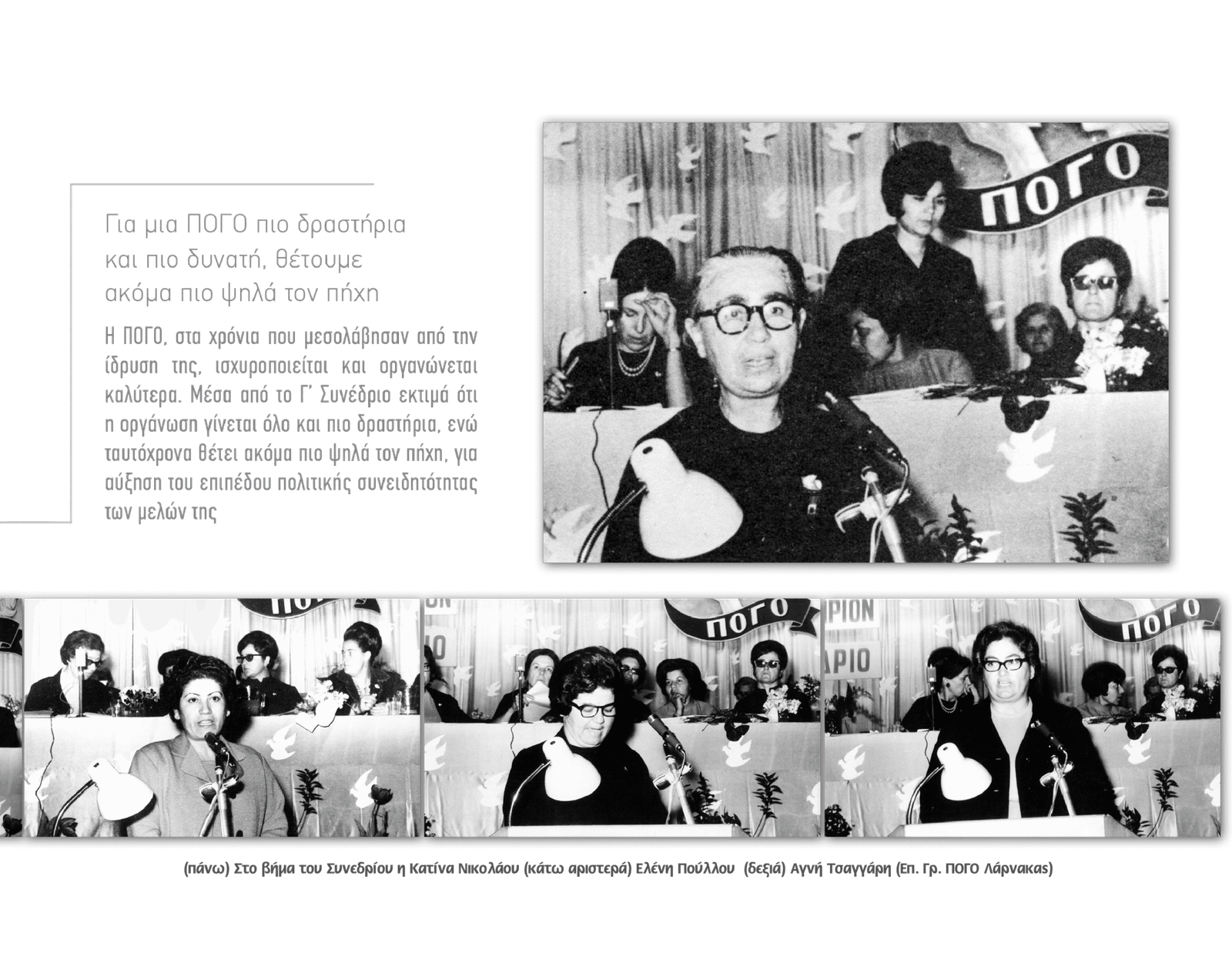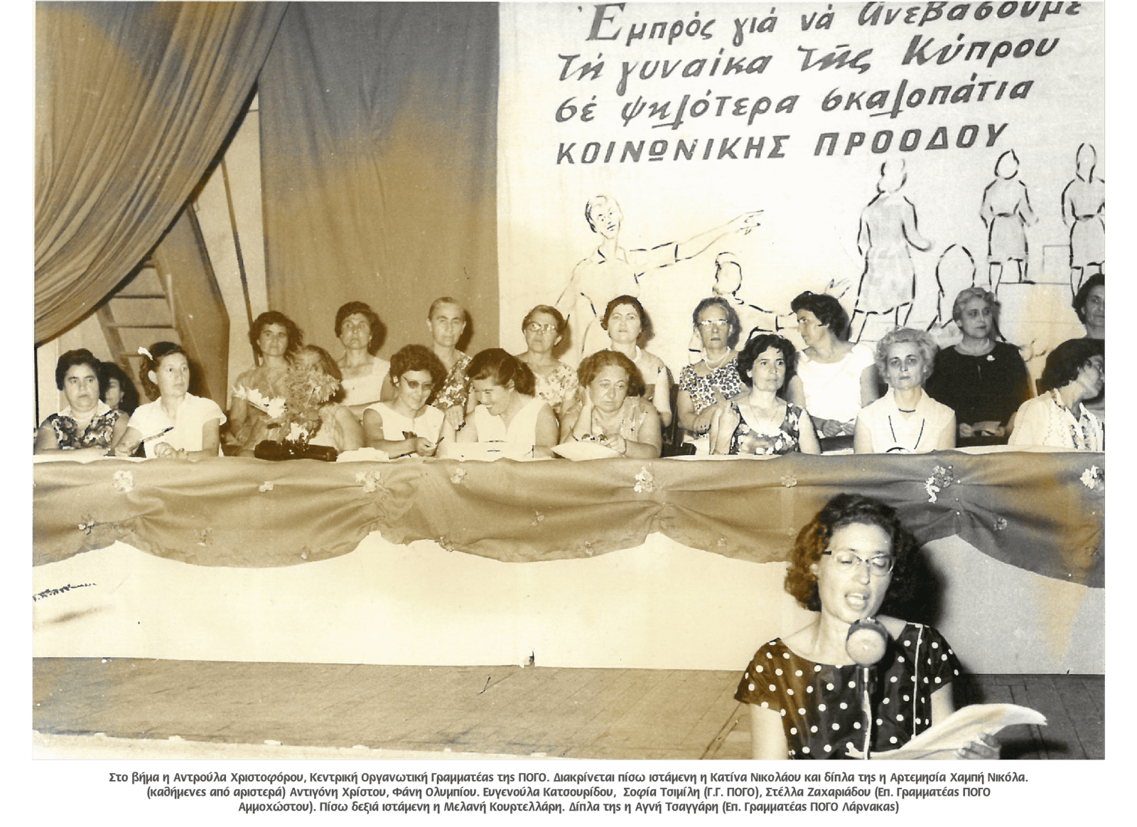 • Σύνθημα: «Εμπρός για να ανεβάσουμε τη γυναίκα της Κύπρου στα ψηλότερα σκαλοπάτια της κοινωνικής προόδου».