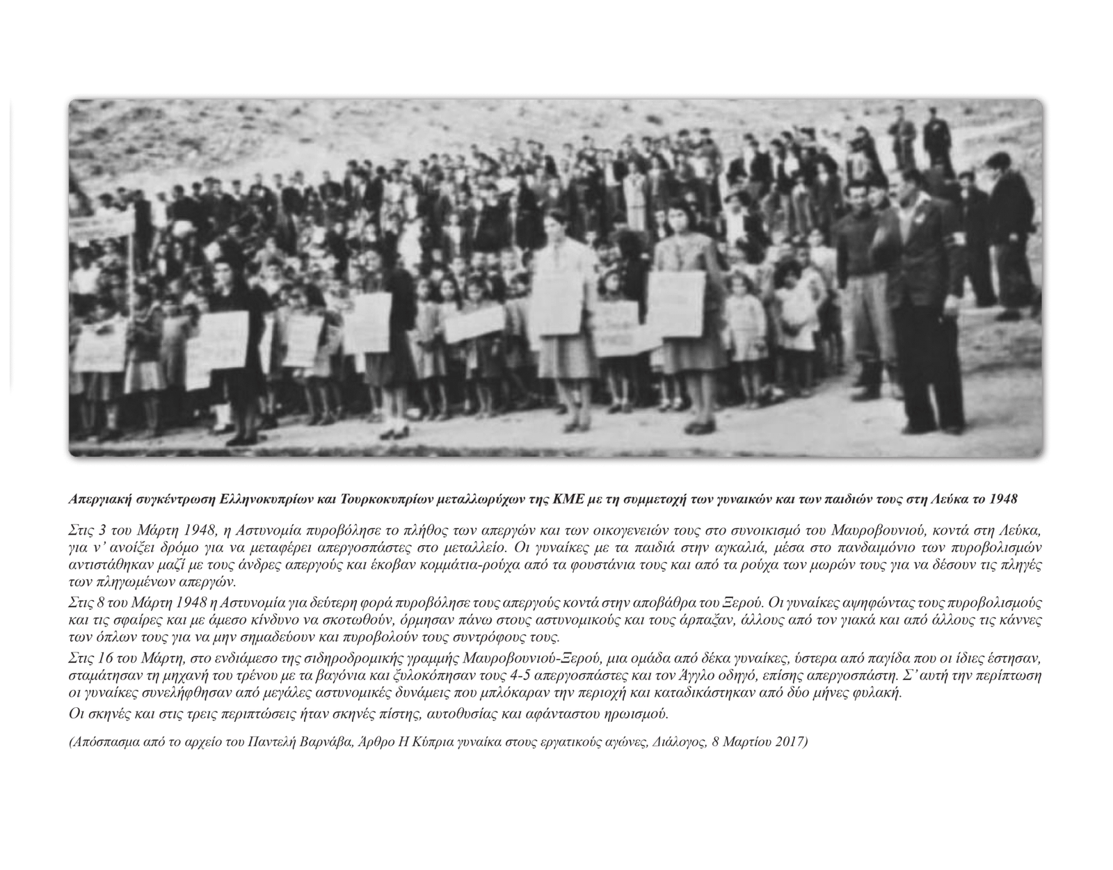 Η ανάγκη για πολιτικό αγώνα ενάντια στην αποικιοκρατία, η ανάγκη για αγώνα υπέρ της ειρήνης, για βελτίωση της θέσης της Κυπρίας, δημιουργούν τις συνθήκες για μια μαζική γυναικεία οργάνωση στην Κύπρο. Στην πορεία προς την ουσιαστική μορφοποίηση ενός μαζικού, οργανωμένου γυναικείου κινήματος, καθοριστικής σημασίας υπήρξε η αγωνιστική συμμετοχή Ελληνοκυπρίων και Τουρκοκυπρίων γυναικών, στους μεγάλους απεργιακούς αγώνες των μεταλλωρύχων της Κυπριακής Μεταλλευτικής Εταιρίας, το 1948. Εκεί ξεδιπλώνεται και κορυφώνεται η αγωνιστικότητα των γυναικών, οι οποίες, σε τρομερά αντίξοες συνθήκες παλεύουν μαζί με τους άντρες για 124 ολόκληρες μέρες.