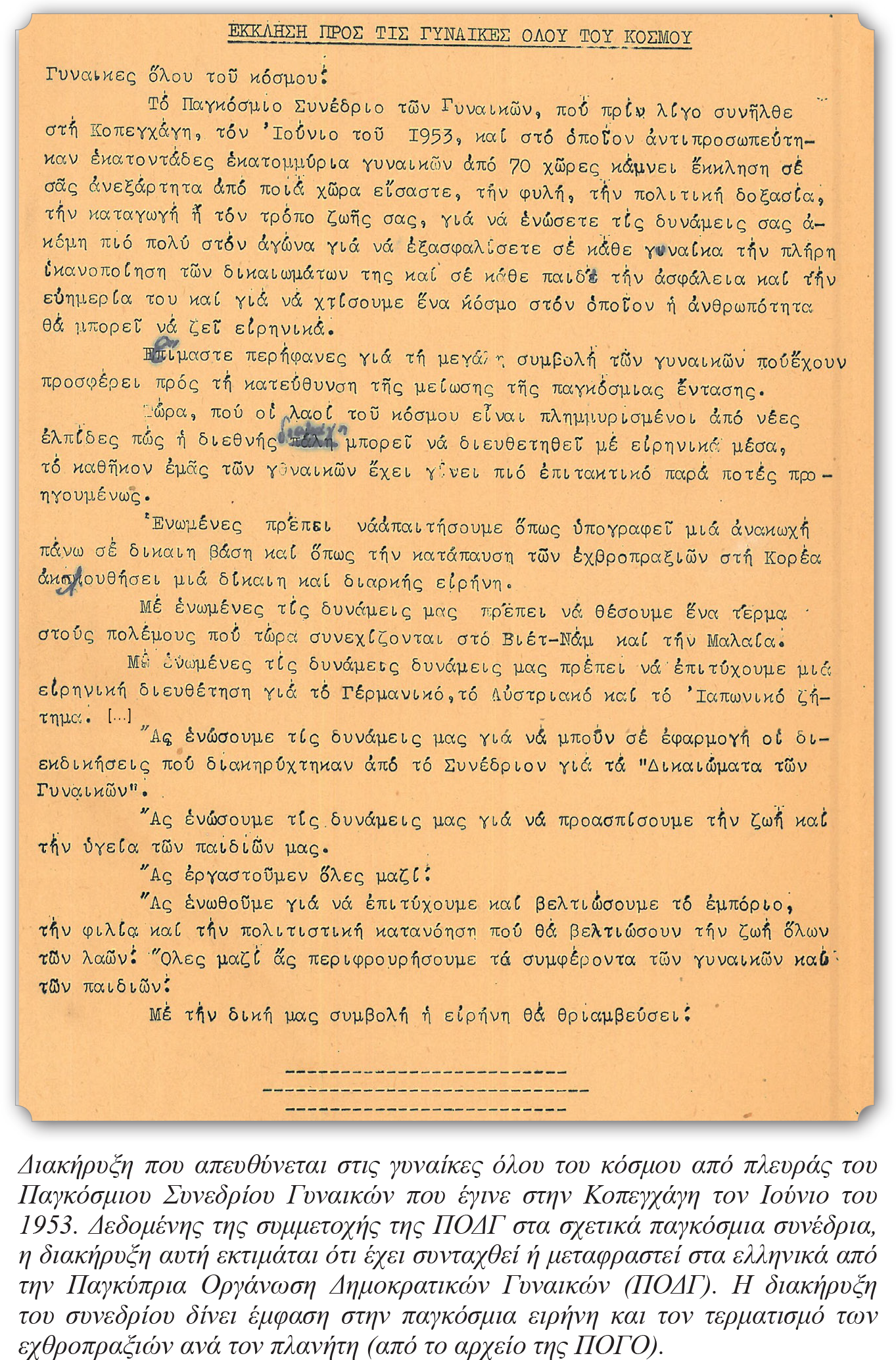 Η ΠΟΓΟ δεν είναι απλά μια οργάνωση που διεκδικεί ορισμένα μέτρα που θα βελτιώνουν τη θέση των γυναικών. Στα 75 χρόνια της δράσης του, το Γυναικείο Κίνημα της ΠΟΓΟ βρίσκεται στην πρώτη γραμμή των αγώνων, έχοντας την πεποίθηση πως η οργανωμένη πάλη και η συλλογική διεκδίκηση είναι ο μόνος δρόμος για το μέλλον, το μέλλον της κοινωνικής ισότητας και της ισοτιμίας των φύλων. Για τη νέα, την ποιοτικά ανώτερη κοινωνία, που θα είναι από τα θεμέλια της δίκαιη. Για το νέο κόσμο, που δεν είναι απλά εφικτός. Είναι αναγκαίος και επίκαιρος: ο κόσμος της ειρήνης και του σοσιαλισμού!